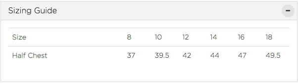| Half Chest (cm) | 37 | 39.5 | 42 | 44 | 47 | 49.5 |